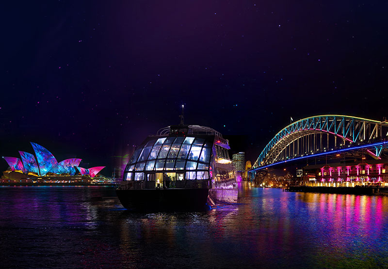 This premium package pairs our signature 4-course dinner with a selection of wine, beers, and soft drinks, all served aboard our stunning glass boat. Every seat offers dazzling views through floor-to-ceiling windows, so your entire group enjoys front-row seats to the Vivid Light displays on the harbour.